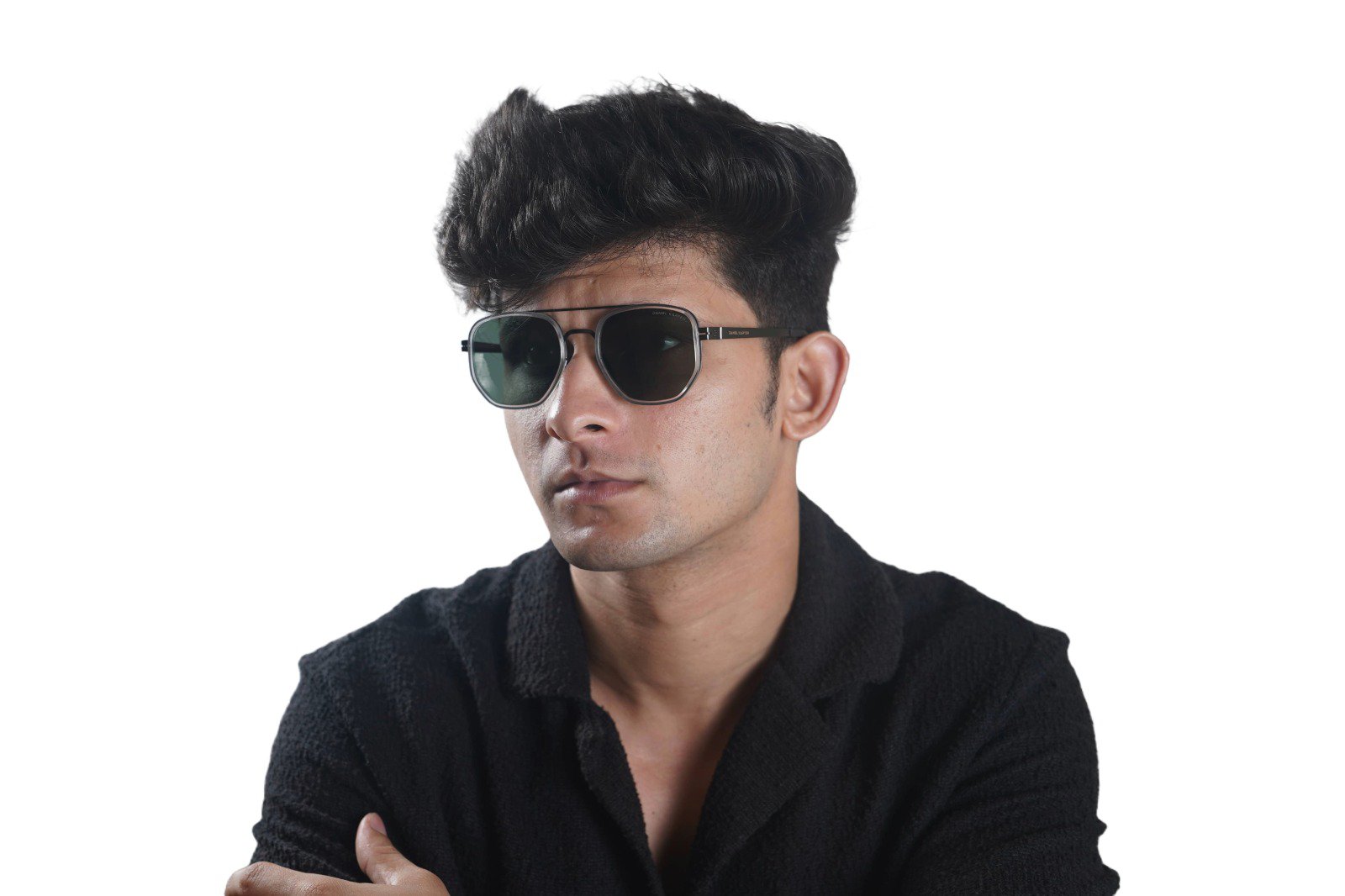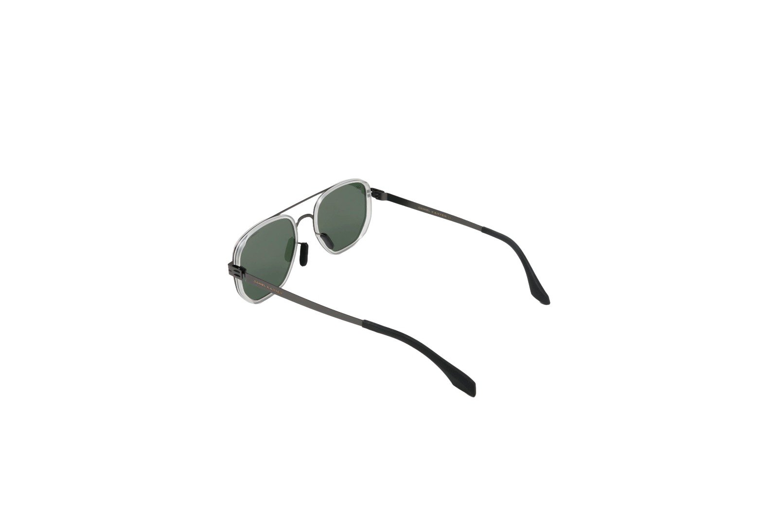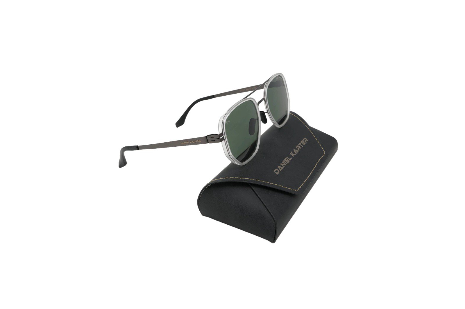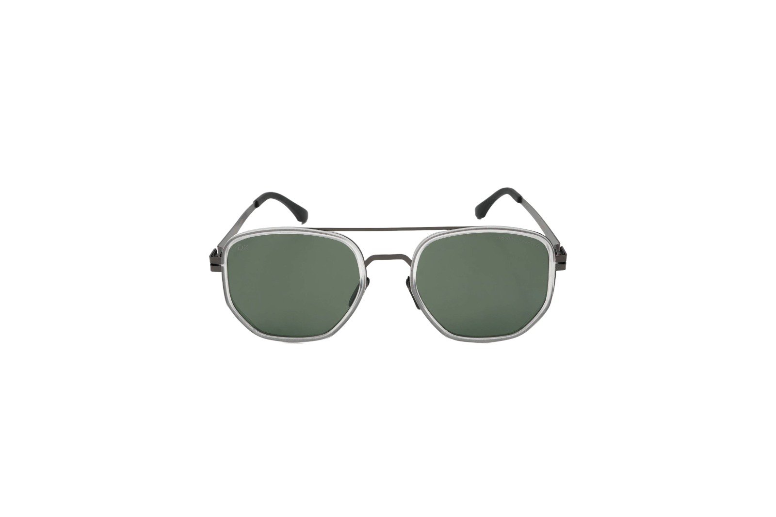 Daniel Karter Phoenix: A bold, multi-material hexagonal design. This metal frame features a dark gunmetal finish with a distinctive white accent border around the lens. Finished with sharp dark green lenses.