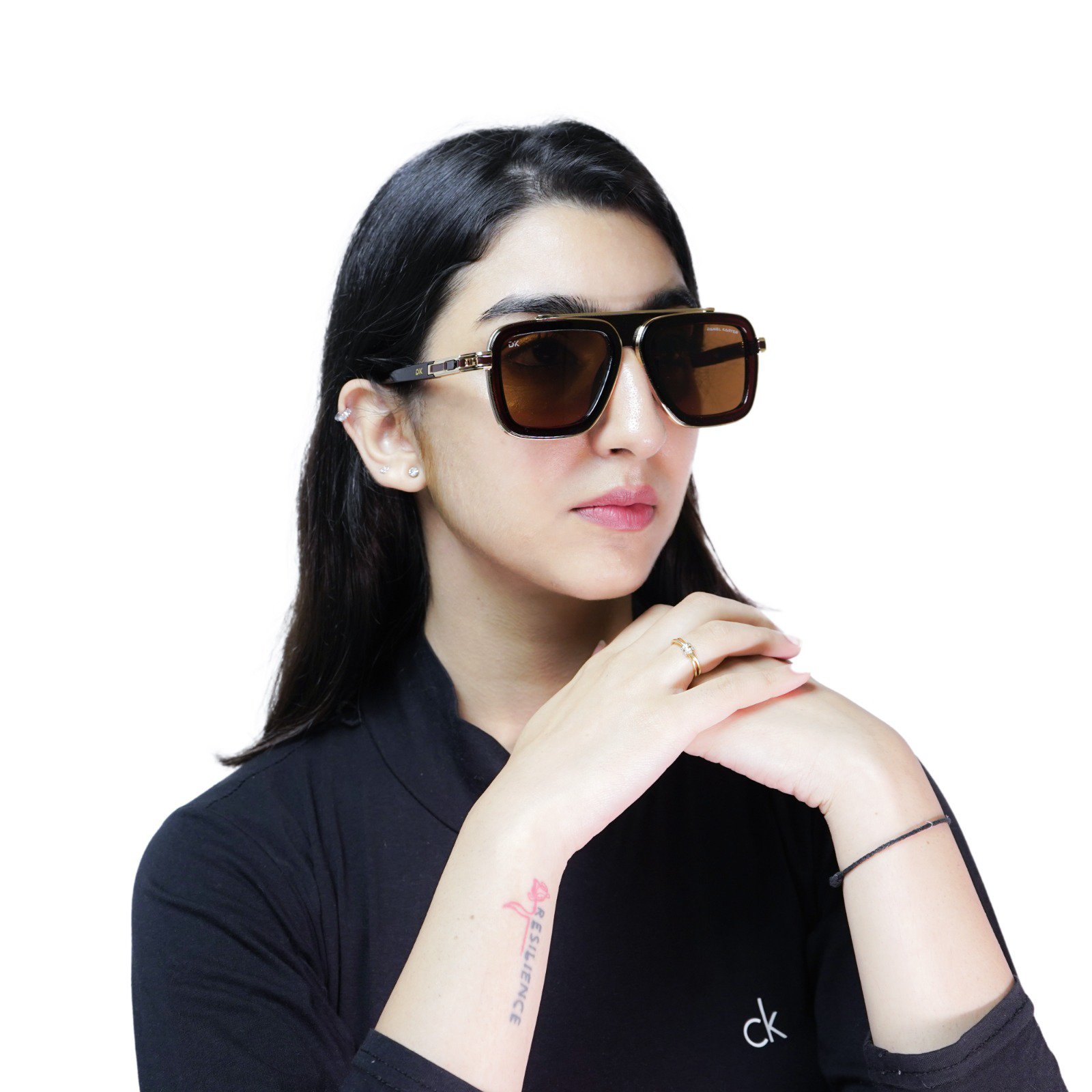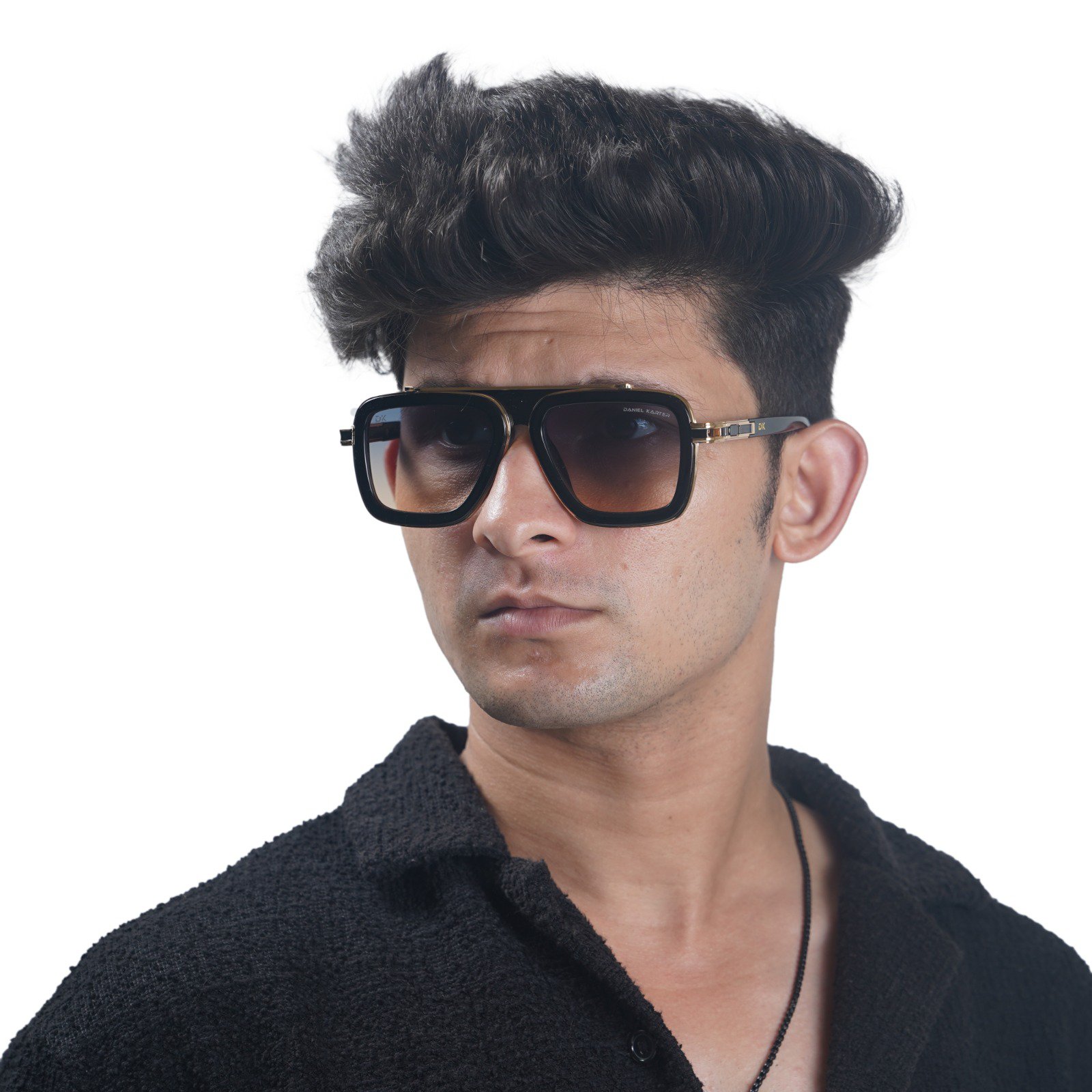 Inspired by the iconic styles of Hollywood and haute couture, the Navigator model offers a powerful and sophisticated look. It features a unique, layered construction: a sleek black acetate (or plastic) frame encased by sophisticated gunmetal or silver-tone metal accents. The distinctive double bridge and temple detailing (note the DK logo hardware) lend a feeling of premium craftsmanship and exclusivity.