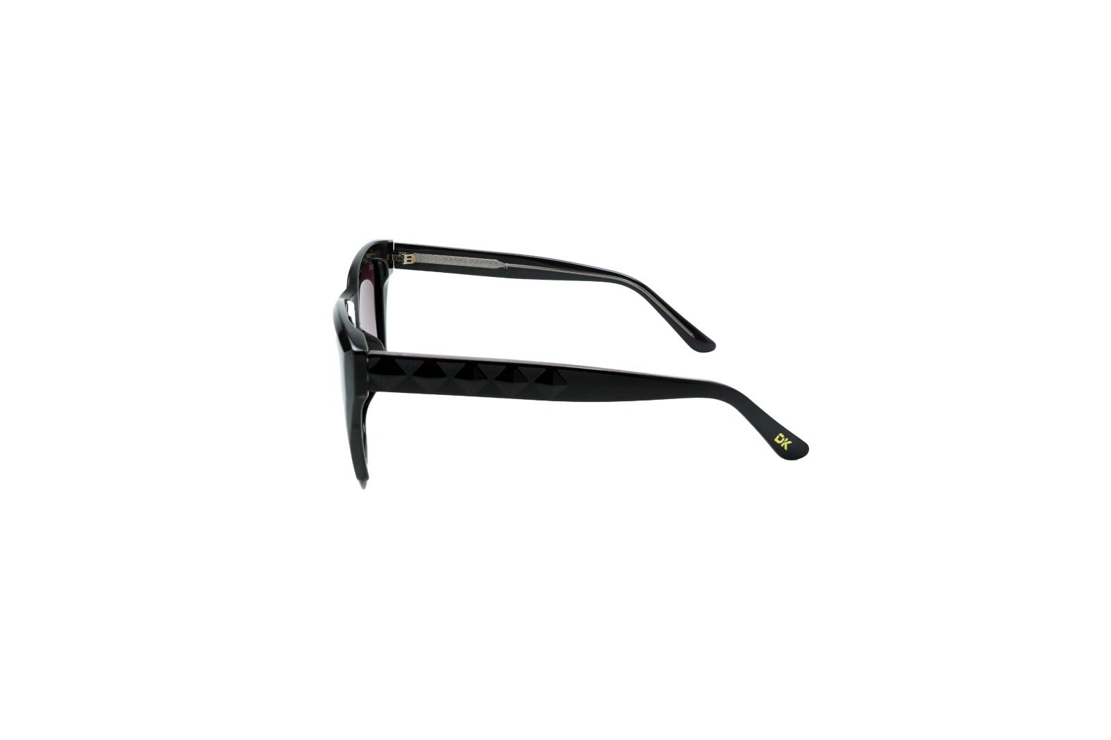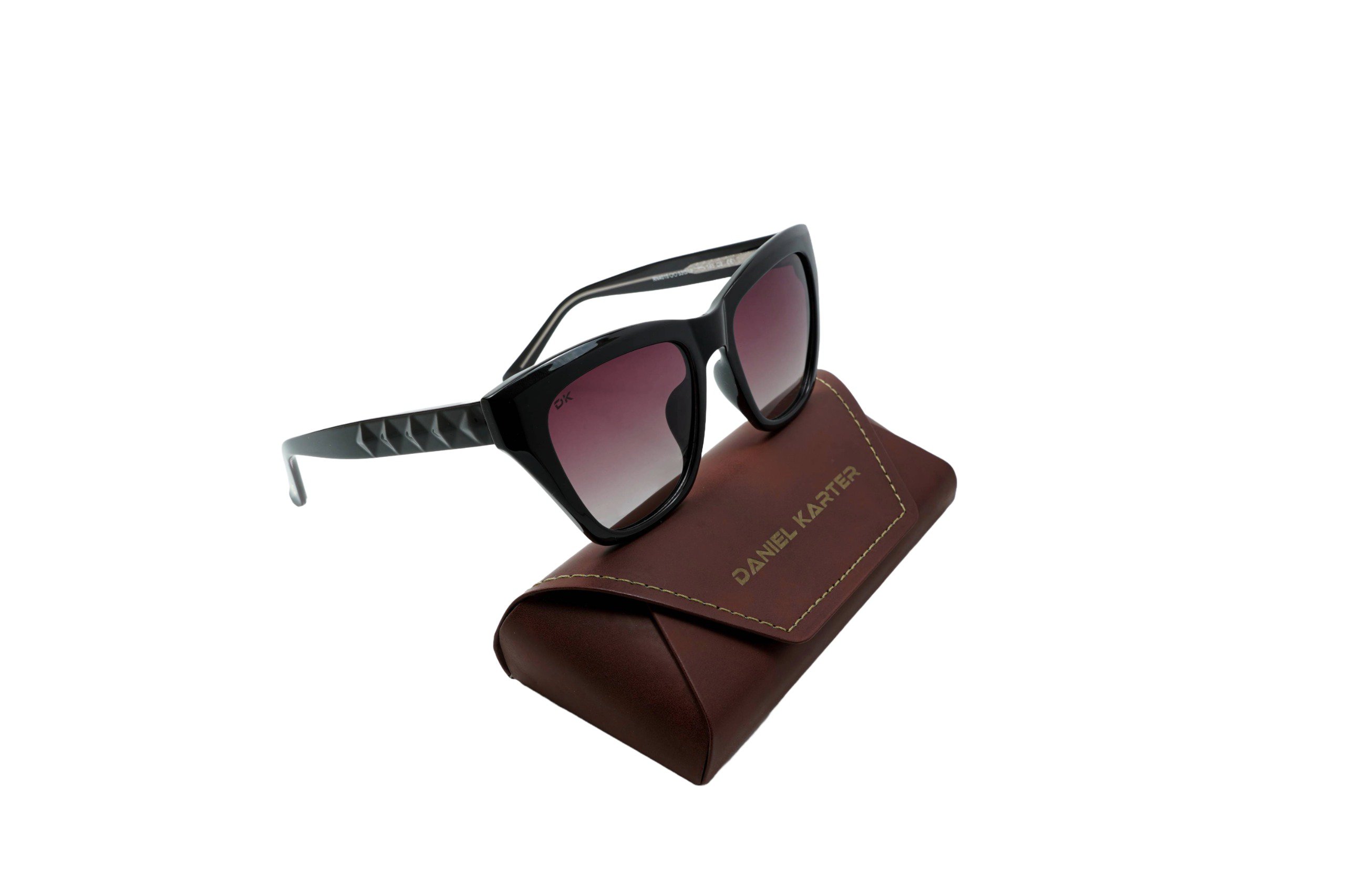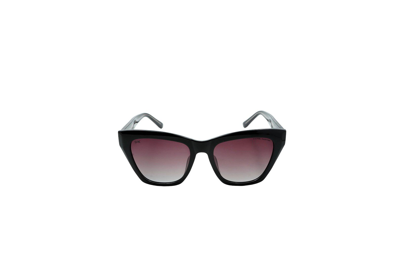 Make a bold statement with the Crimson Siren cat-eye sunglasses by Daniel Karter. Featuring a striking translucent purple frame with a patterned temple and dark lenses. 100% UV Protection.