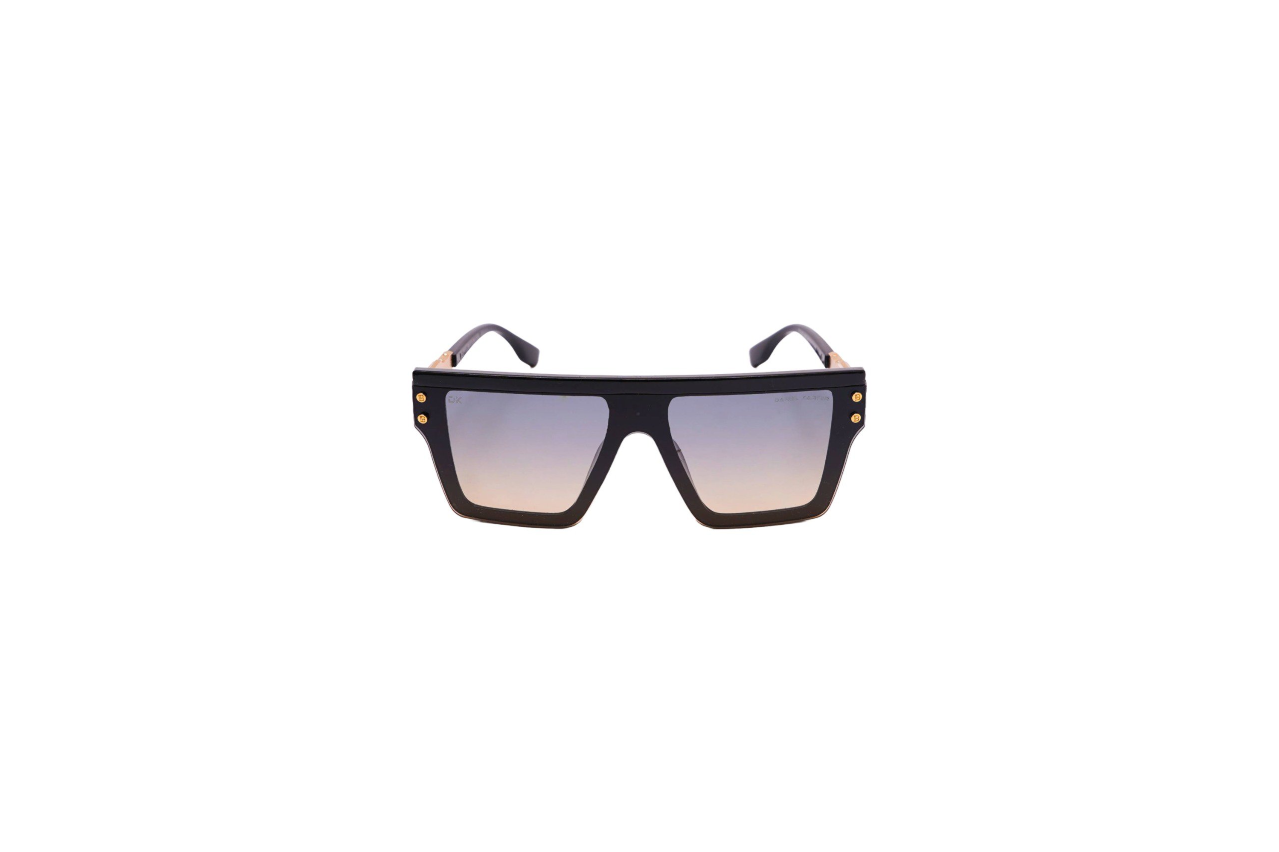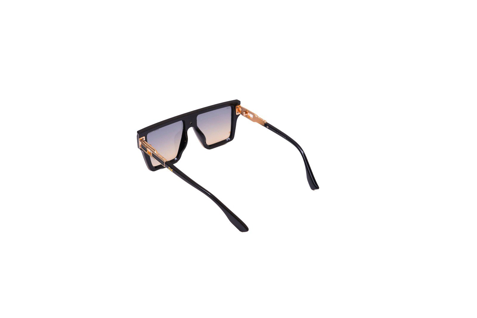 The Frame: The silhouette is a modern, aggressive square shape featuring a bold, single-piece shield-like brow line. Crafted from smooth, high-quality black acetate, the Dominate the fashion landscape with the Commander Flat-Top Shades. These oversized, square sunglasses feature a dramatic black frame with a prominent flat top, accented by striking gold rivet detailing and temples. The unique sunset gradient lenses (blue-to-peach) provide an unforgettable look and complete UV400 protection. Includes a premium Daniel Karter case.