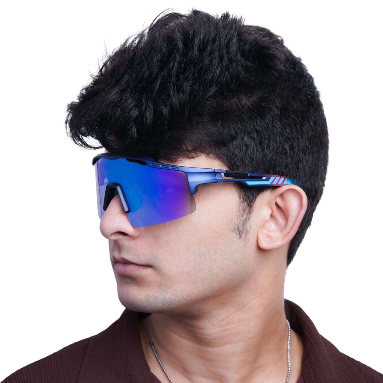 The Daniel Karter Spectrum Shield Sports Sunglasses combine cutting-edge optics with a sophisticated, athletic design. The dominant Deep Blue matte frame is subtly accented with futuristic pink and cyan highlights, creating a look that is both professional and intensely energetic. This is the perfect gear for high-speed performance in the Delhi sun or on the track.